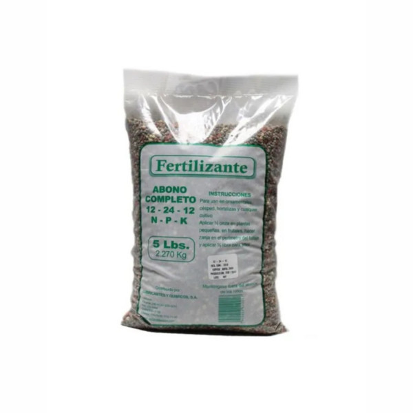 Fertilizante completo con fórmula 12-24-12, favorece el desarrollo de raíces fuertes, floración y crecimiento equilibrado. Presentación de 5 lb.